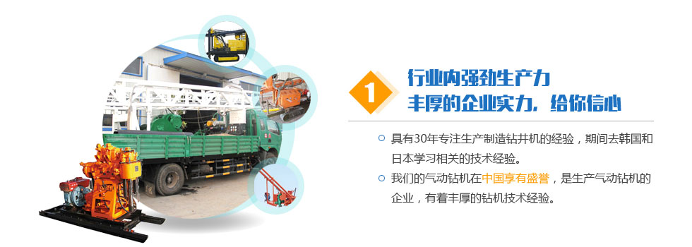 客戶共創(chuàng)雙贏。堅持科技先導、質量第一、信譽第一。讓我們用真誠的智慧共同締造事業(yè)的成功。讓我們用真誠的智慧共同締造事業(yè)的成功。希望與您的合作,能為我們的雙方共添輝煌。經營宗旨:質量求生存,信譽樹品牌,價格贏打井設備市場,創(chuàng)新圖發(fā)展。我們將以一流的技術換取您的信賴和欣慰。公司以人為本,廣納天下人才,技術力量雄厚。公司堅持以人為本,以優(yōu)取勝,精誠服務,持續(xù)改進的質量方針和氣動鉆機服務宗旨。真誠地與氣動鉆機